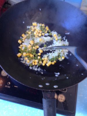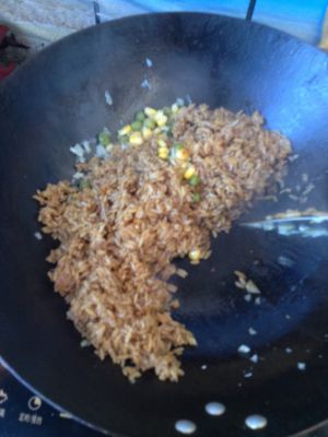 重新起锅,倒入少量油,放入一部分葱花,翻炒,等葱花出香味了,放入之前搅拌好的米饭翻炒,然后再放入之前炒好的鸡蛋和剩下的葱花,再翻炒几下,最后一步,放入少量蚝油翻炒几下,出锅即可~