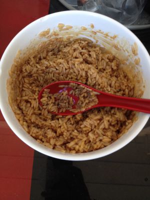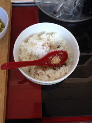 在米饭中加入2勺酱油一勺料酒少许老抽还有一点点糖,搅拌均匀备用.
