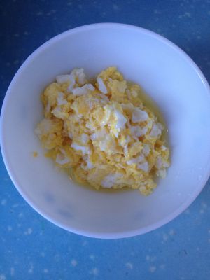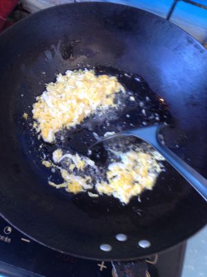 锅内放入油,油热下入打散的鸡蛋,鸡蛋成块变熟。