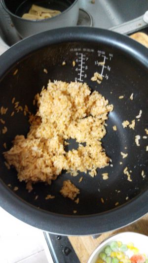 加油,放葱姜沫炒,再放蔬菜粒 ,最后放拌匀的米饭。炒匀。