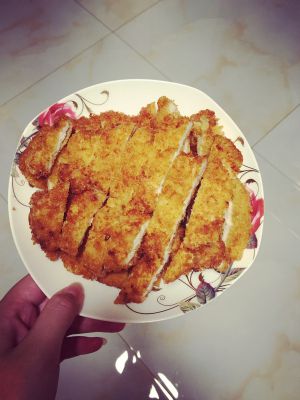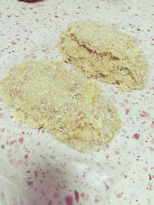 盘子里放面包糠,令鸡肉均匀粘满面包糠。(面包糠制作方法见我的菜谱)