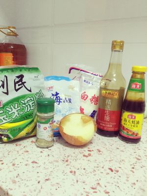 生抽,盐,糖,淀粉,黑胡椒粉,腌制1个小时。