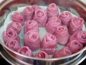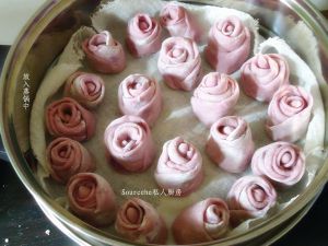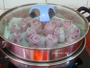 蒸笼垫上纱布,把做好的紫薯馒头放上;