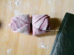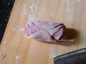 三种颜色的面团擀成厚薄适中的牛舌状,菠菜面放在最外面一层,用小刷子刷入一层薄薄的水然后放入第二层南瓜面、放入水,在放入第三层紫薯面,然后卷起来,用手搓成长扁条