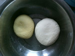 将酵母分别倒入面粉中,揉成光滑面团。(南瓜泥有点干,可适当加些水。)
