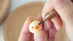 用棉签画上小鸡宝宝的嘴巴(橙色)和脸蛋(粉色)。