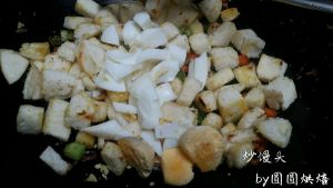 锅热油,放入葱花,磕入鸡蛋不要搅,紧接着倒入馒头,翻炒至馒头金黄色略焦,放少量盐出锅(如果家里有虾皮,在放葱花前放虾皮,口味更佳)