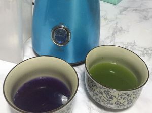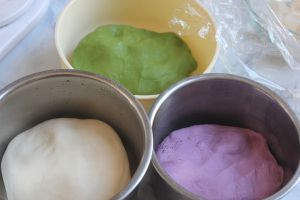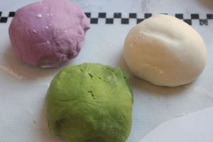 绿色面团要事先将菠菜洗干净后丢入原汁机出汁,紫薯粉混合牛奶搅匀。