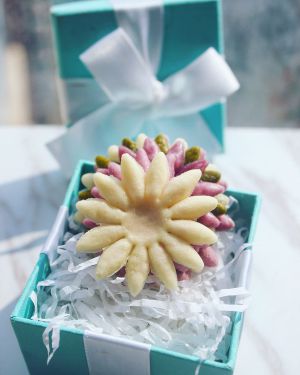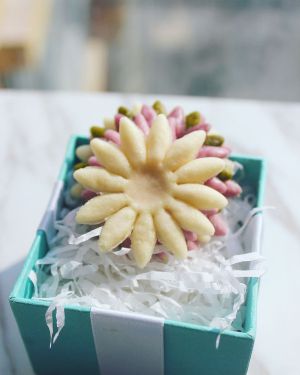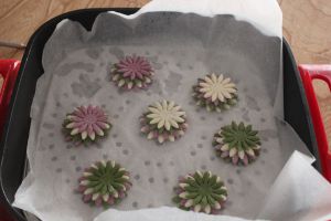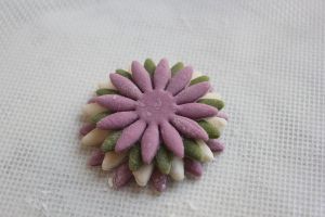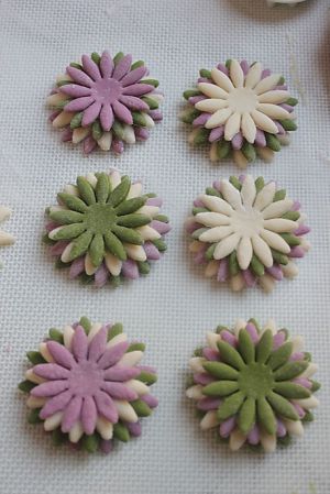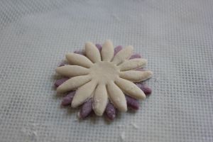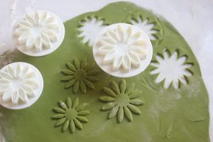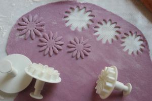 用擀面杖擀成薄片,用小雏菊模具压花,这一套模具是大中小三种的。