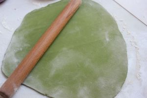 揉匀排气后擀成薄薄的长方形大面片(不要超过1cm的厚度);
