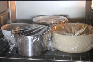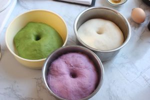 三种面团盖保鲜膜放入烤箱发酵档等待发酵。