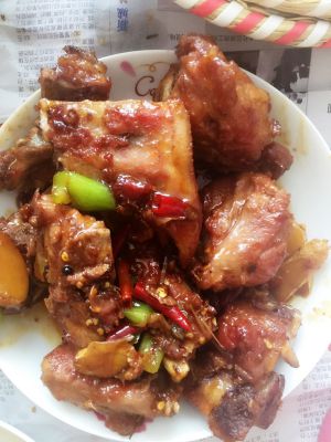 然后再入葱姜蒜,干辣椒,酱油,白糖或者冰糖翻炒,翻炒过后加之前煮排骨的水适量炖煮