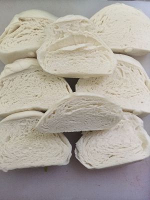 馒头切片,因为馒头是刚出锅的所以好切,如果是剩馒头,把刀上蘸水再切就不容易掉渣
