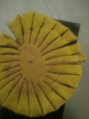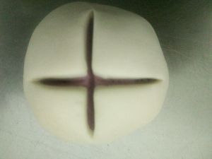 将面团分成四大块 没一个大块分成6小块 做成大小差不多的面饼 排列铺好 从内向里卷起来 中间切一刀