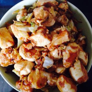 白菜入色后加入一小杯水,煮沸后加入馒头翻炒,让馒头均匀的着色,盖盖焖几分钟后再将白菜和馒头拌一下,就可以出锅了。