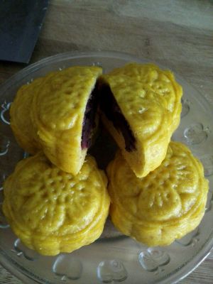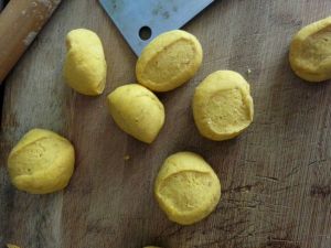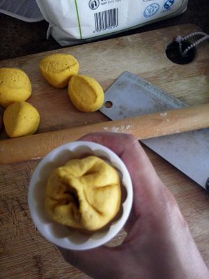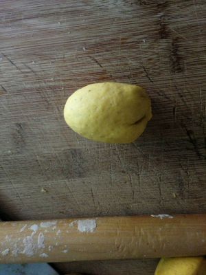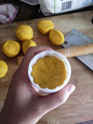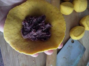 南瓜面皮分成小块,擀成小包子皮,加入红豆馅,像包包子一样包起来。