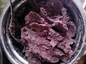 先制作红豆馅: 红豆(没泡)洗干净,放电饭锅里,加水一指节高,煮30分钟左右,水就全干了,红豆也正好煮软。红豆干湿正合适,无须再炒。 按口味放些白糖。 稍凉后,放入保鲜袋里,用擀面杖敲打成泥。