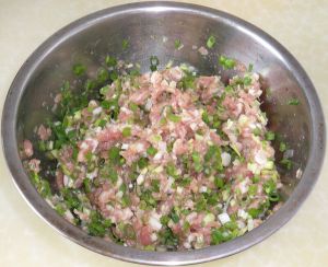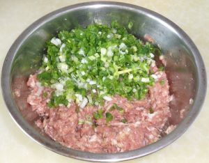 加入葱沫 姜水两勺拌匀,因为孩子要吃我就没加其他杂七杂八调味料,他不吃姜,清水加几片姜泡的水倒在里面去腥,还吃不出姜味,可以吃姜的直接切成沫加里面