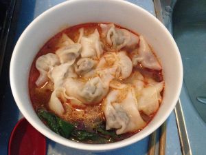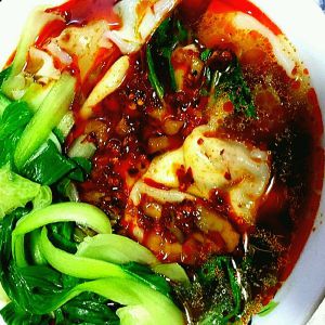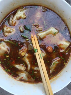 辣椒油三勺,葱末,蒜末,生抽一勺,盐适量,醋一勺,花椒油适量,调好味的碗里加两勺煮过抄手的汤