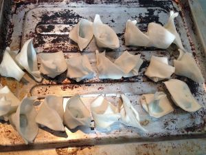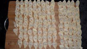 准备半碗清水,筷子把肉馅夹一坨放在面皮上,如图抹上水角对折