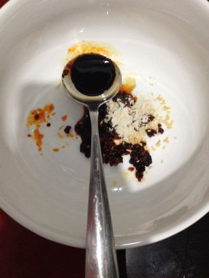 空碗里放辣椒油、酱油、白胡椒粉和鸡精