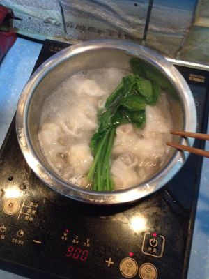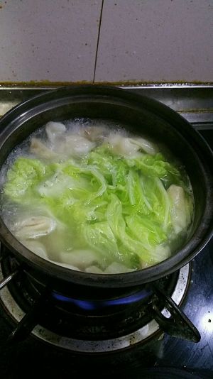 水开之后先放入白菜,白菜煮的时间会长一点,在从冰箱里拿出已经包好的馄饨,放在锅里煮,快熟的时候放入油菜
