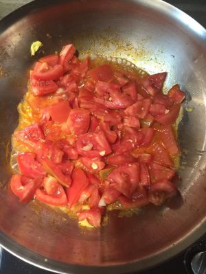 锅里再倒少许油,放葱姜蒜爆香,下西红柿,中火,盖盖子闷出汁。