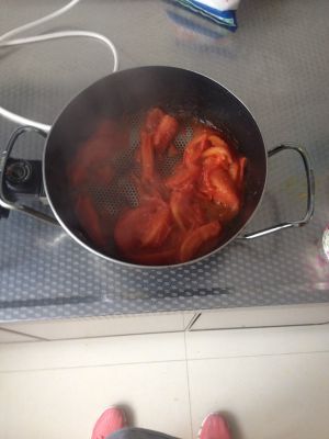 西红柿去皮切块,大蒜切片爆香锅底后放西红柿炒出汁后加少许糖