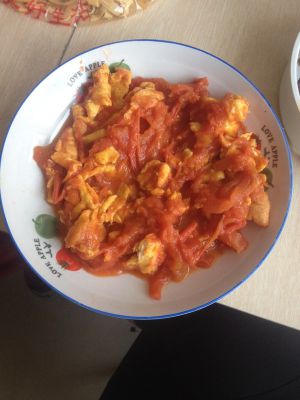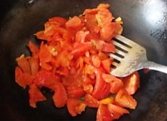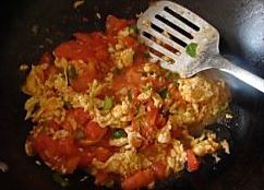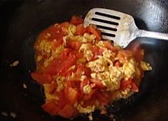 再放进炒好的鸡蛋,用锅铲边炒边挤压出西红柿的汁水。