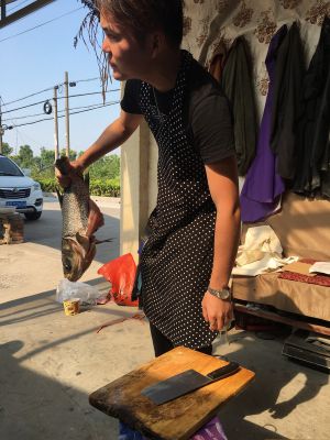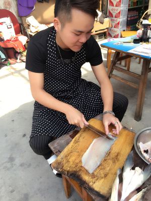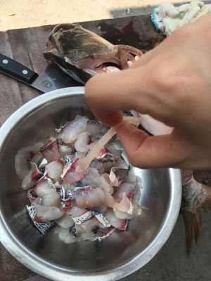 鱼肉削片,鱼骨切断,清水洗净,备用。