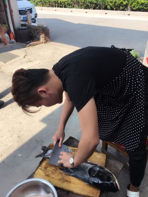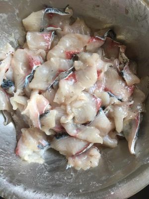 盐,料酒,研制十分钟,洗净。加入酸菜调料包中的腌鱼料粉,研制半小时。