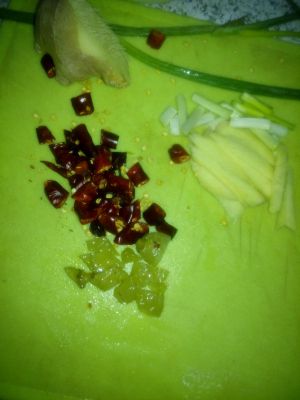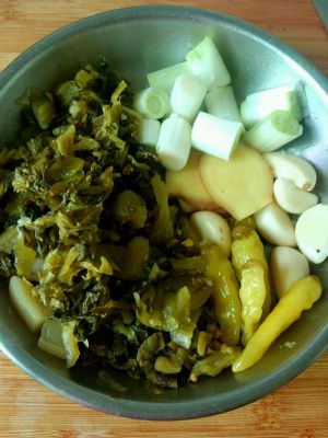 酸菜洗几遍,切碎,准备葱段,姜片,蒜瓣,加泡椒更爽辣;