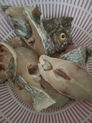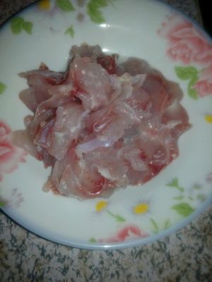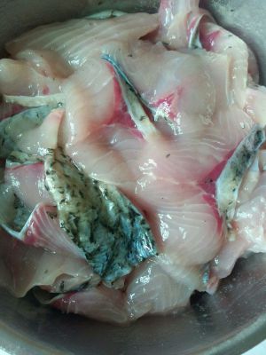 鱼洗干净,剔骨,切成段,肉切片,不用切太簿,太簿了煮时容易断。然后分开装入盘,同样的方法,放料酒,盐,姜片,半个蛋清分开拌入骨和肉片里,所以放进去拌匀腌半个小时。