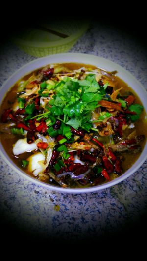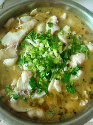 把鱼片一片一片放进汤里,不要搅动,锅开,鱼片变白后即可,倒入成鱼骨大盆;最后浇一大勺花椒热油,撒上葱花香菜,OK!一盆爽滑,香辣,开胃的酸菜鱼开吃啦!