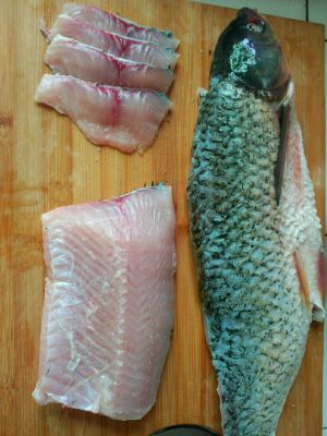 草鱼洗净劈开,分成鱼骨和鱼肉,鱼肉片薄片,鱼骨切段;