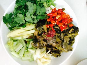 泡菜,泡椒,泡萝卜切小块,姜,芹菜,蒜切片备用,香菜,葱切段