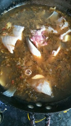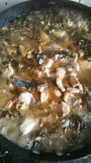 油热了,放姜蒜,芹菜泡菜下油锅炒香,加水煮开,先放鱼头,大块的鱼肉,最后放鱼片,煮三到五分钟,鱼熟了试下味道,因为泡菜是咸的,所以最好试下味道再加盐,或者鸡精