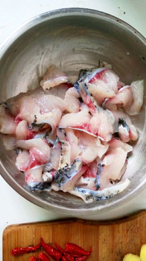 片好的鱼片用清水清洗,完后放在清水中放置几分钟,鱼片水沥干,放入生粉,料酒,少许盐腌制。 把鱼头和鱼尾还有中间部分的鱼和上面步骤一样,用生粉、料酒、腌制。