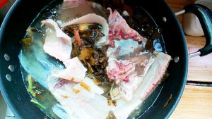 锅中浇油烧热,放入葱姜蒜爆香,然后下入酸菜鱼菜炒香,加入热水烧开,先下入鱼骨,再下鱼片。