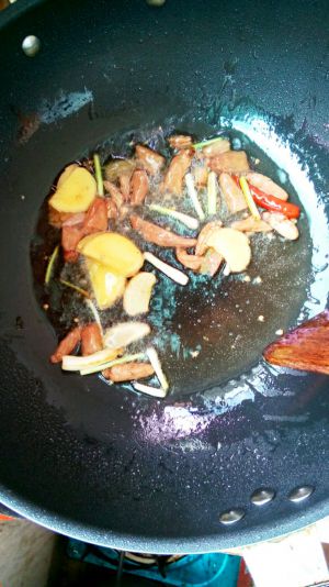 锅倒入油,油热后,倒入姜,辣椒翻炒,在倒入花椒,让花椒入味,在放入豆瓣酱,调色。 把鱼头和鱼尾倒入锅中,用锅铲轻轻的把鱼肉翻面,小心翻烂。