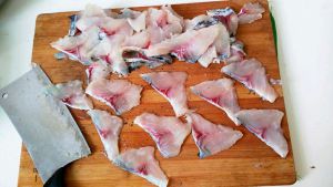 把鱼去磷和内脏,切成小段,放入蛋清,盐,淀粉进行腌制