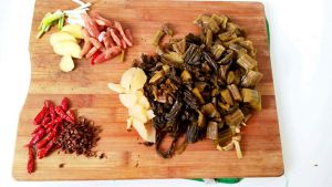 准备好酸菜,葱,姜,蒜,干红辣椒等辅料