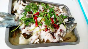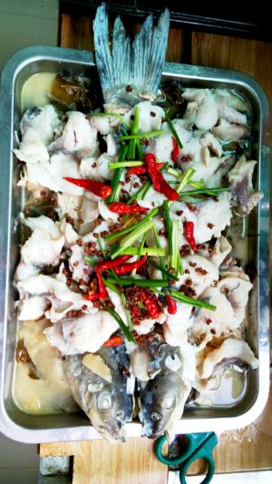 在起一热锅,放入油,花椒少许,油加热后浇在放有蒜末,葱花的鱼片上,酸菜鱼大功告成,配上一碗米饭,甚是满足。