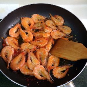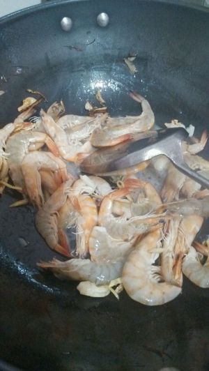 放入虾,加入少许料酒、生抽,进行翻炒。