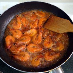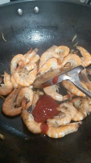 倒入番茄酱,煸炒至每个虾都裹上番茄酱