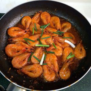 Stp7等虾身全红了,倒入准备好的酱汁,然后用文火,盖起煮至收汁,翻炒一下,加入少许料酒,就可出锅了(我这道菜没另外放盐,因为生抽放的比较多,咸味已经够了。不放心的可以快出锅的时候尝一个试试咸淡,不行再加点盐翻炒一下就可出锅)