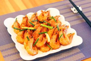 锅内留少许底油,放入糖炒至粘稠,把过油的虾和姜丝下锅,加盐、糖、味精调味;
