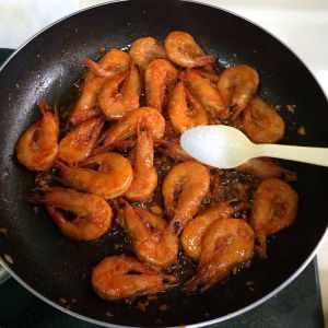Stp6然后倒入腌制好的虾翻(切记,腌制的料酒不要了)