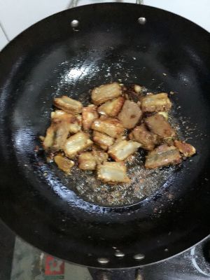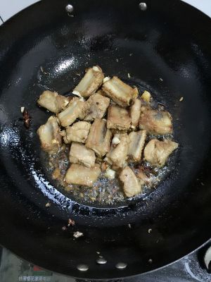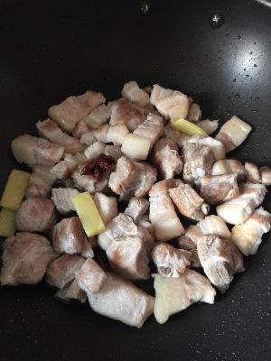 放入焯好的排骨肉,姜、大料,炒至表面微黄