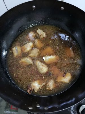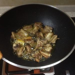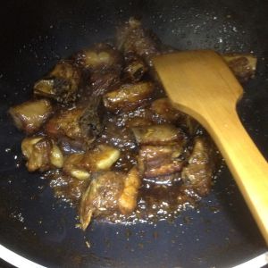 排骨渐黄时滴入酱油上色,两勺醋,料酒适量,盖上锅盖大火闷